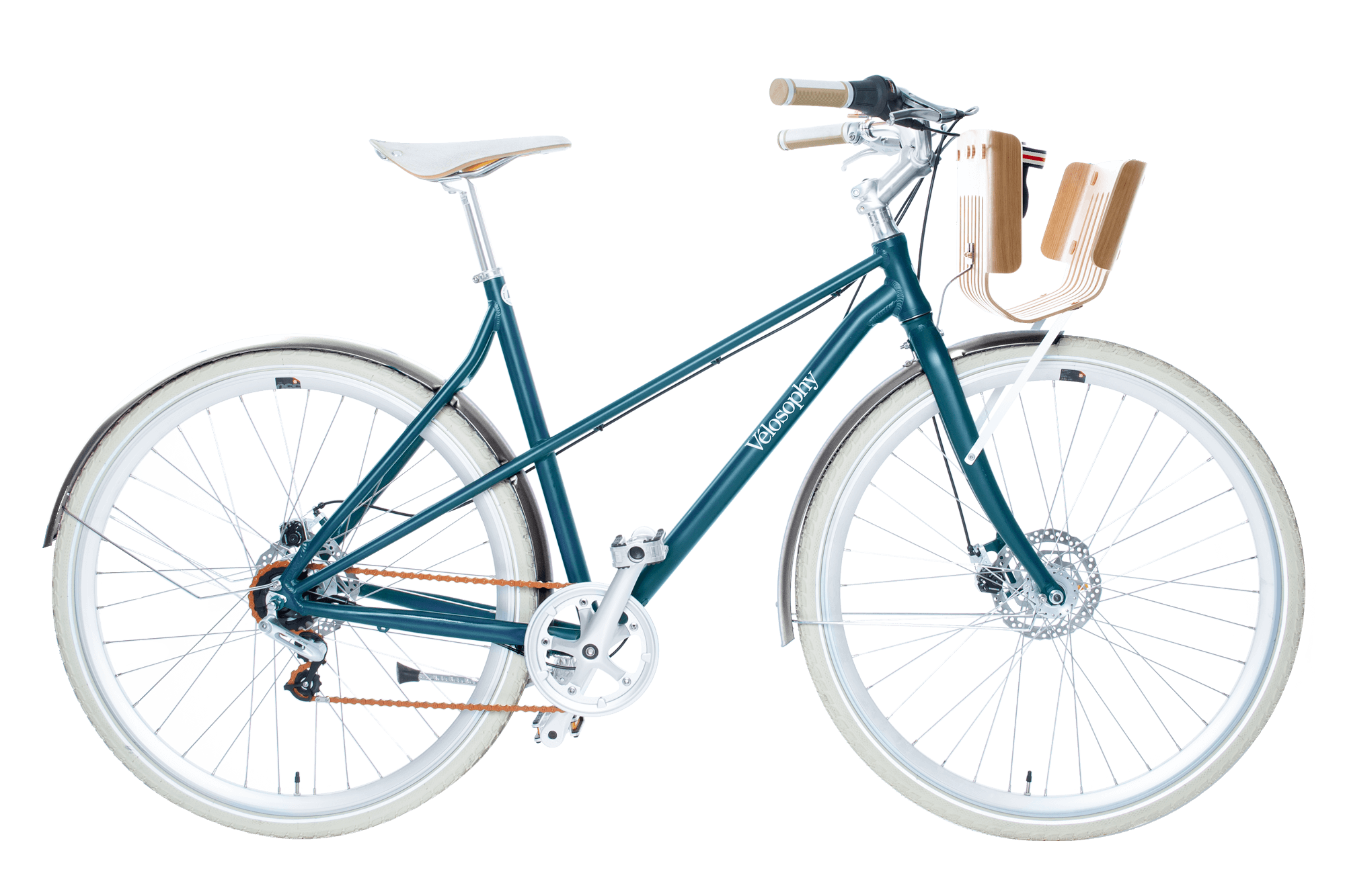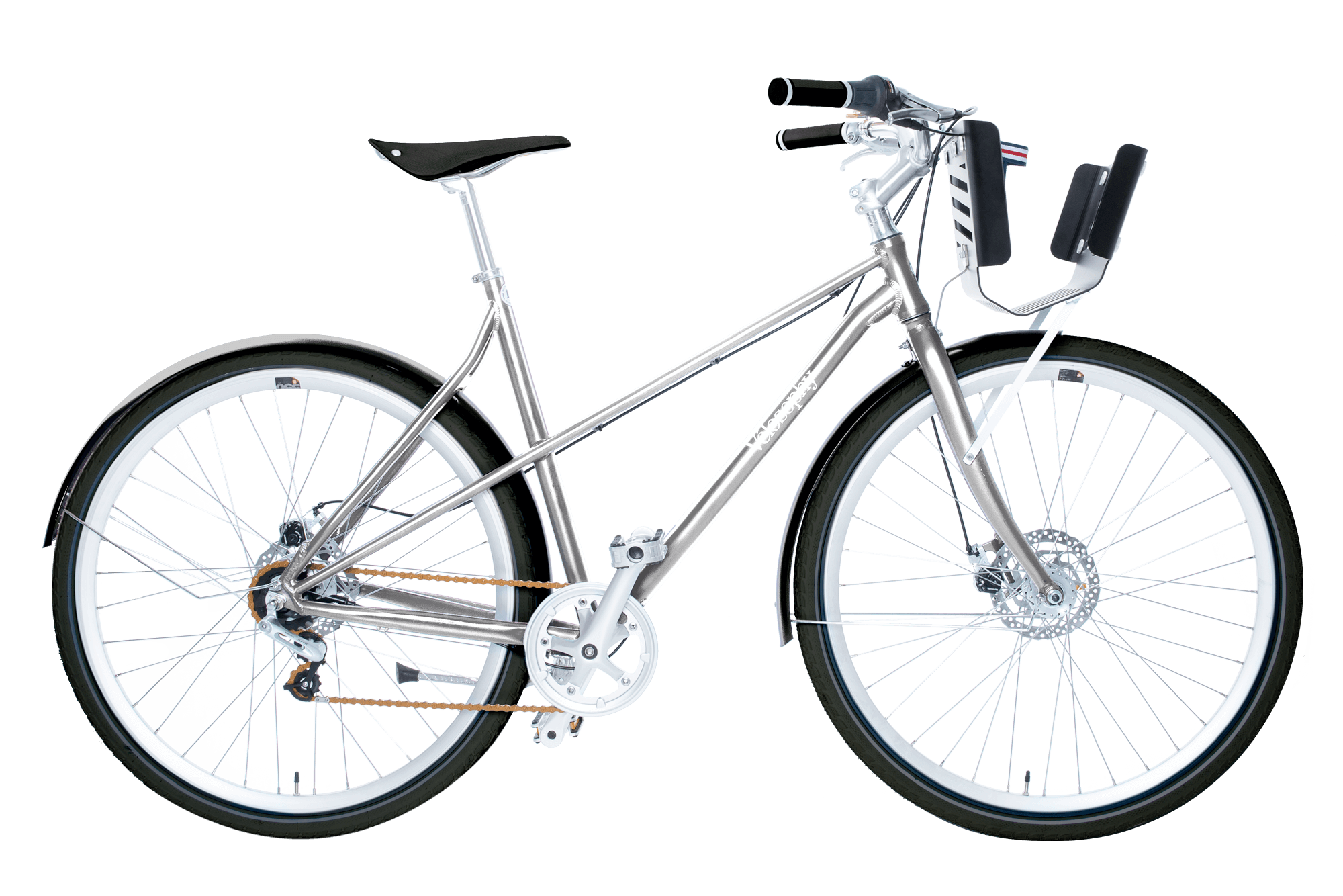 The Vélosophy Comfort edition is an aluminium city commuter equipped with disc brakes, alloy fenders, anti-rust chain and a smooth-shifting 5-speed integrated rear hub.