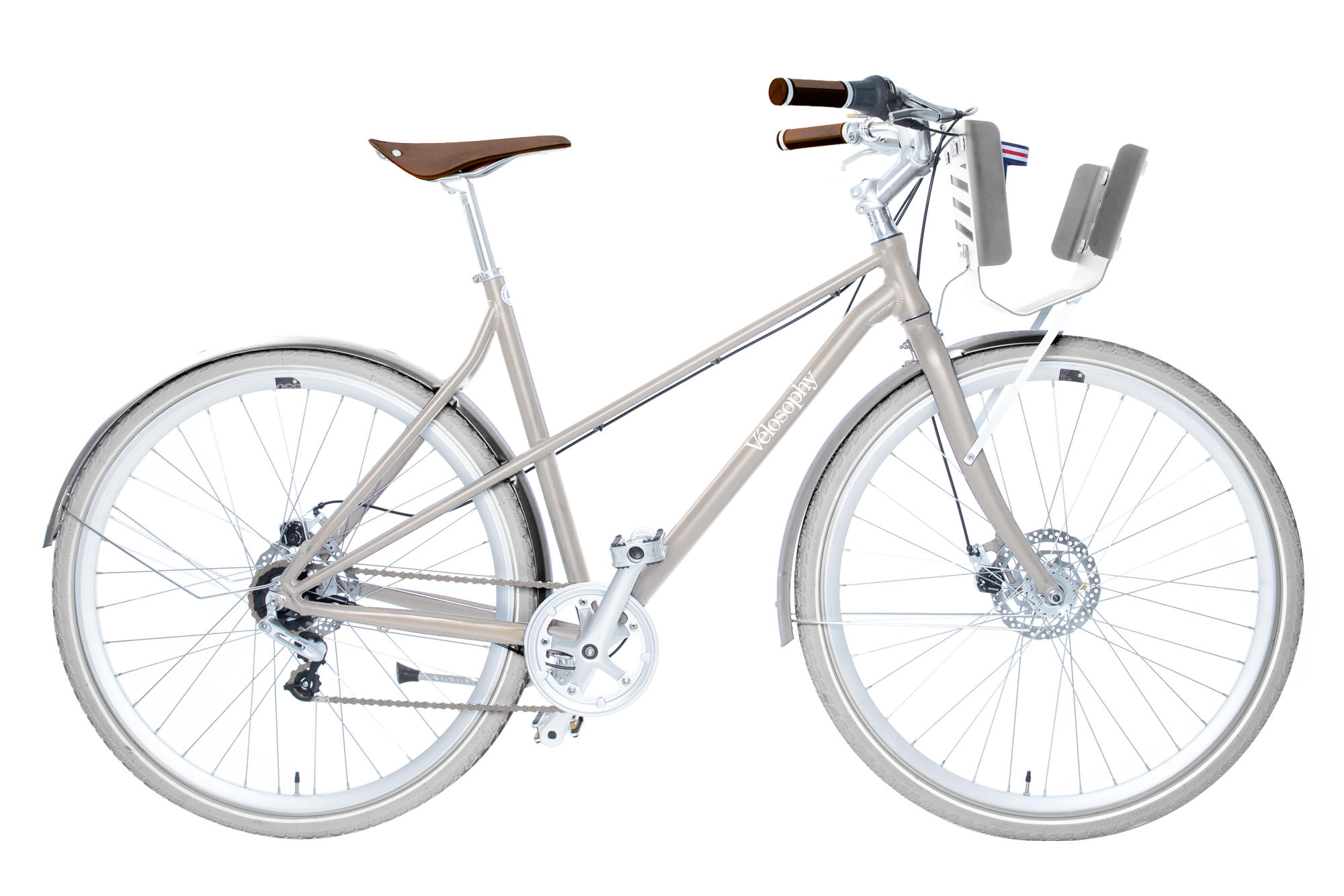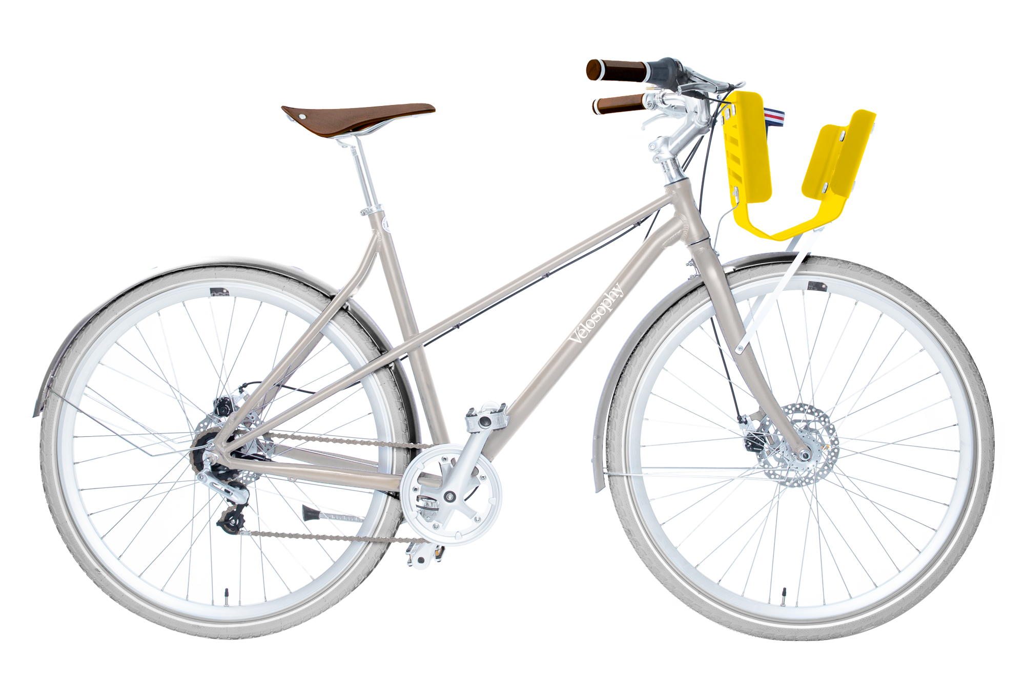 The new Vélosophy Comfort is available in 3 colours; Petrol, Sand and Silver. Both the Petrol and Sand model comes with silver mudguards. The Silver Comfort has black mudguards.